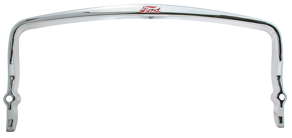 This is Drake’s beautiful match to the rare original. It has every original detail including the correct contours and Ford script, made of extra heavy gauge, precision die-stamped steel with show quality chrome plating. Front or rear, designed for use with bumper guards. Each comes complete with the factory correct mounting stiffeners and special hardware. First introduced in 1940, it also looks fantastic on earlier year cars and pickups. It’s a great way to add factory correct detail while offering protection for your grille or trunk area. Fits Front or Rear Bumpers. Ford painted in red.