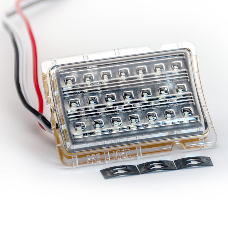 White parking light with amber turn signal. Designed to fit 1940 Deluxe headlight rims only. Replaces your old parking lights and lenses. 12V system. Requires LED flasher unit (2-terminal - 3-terminal). Includes clips. Sold as each.